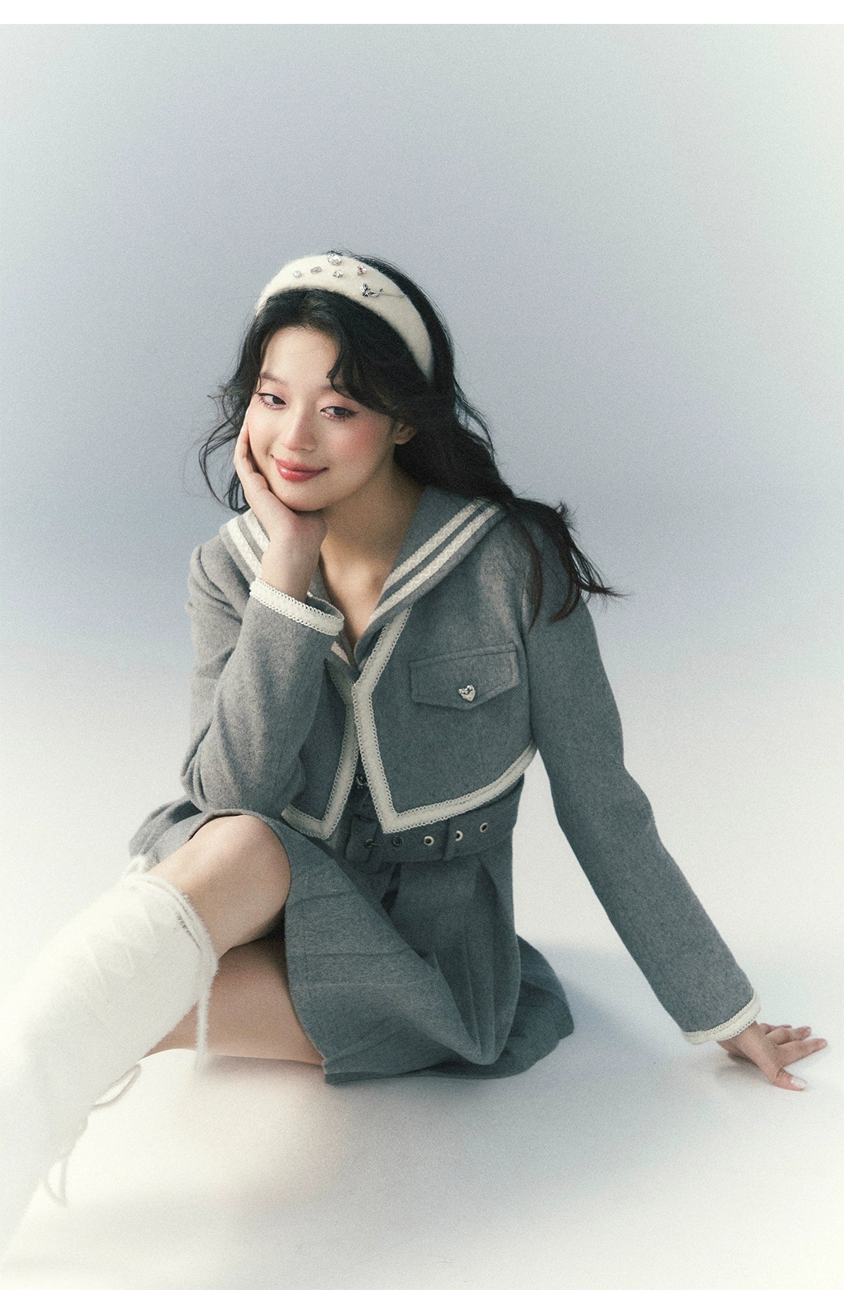 サンセットパークサンセットパークグレーネイビーカラーツイードプリーツドレススーツ秋用ツーピースセット