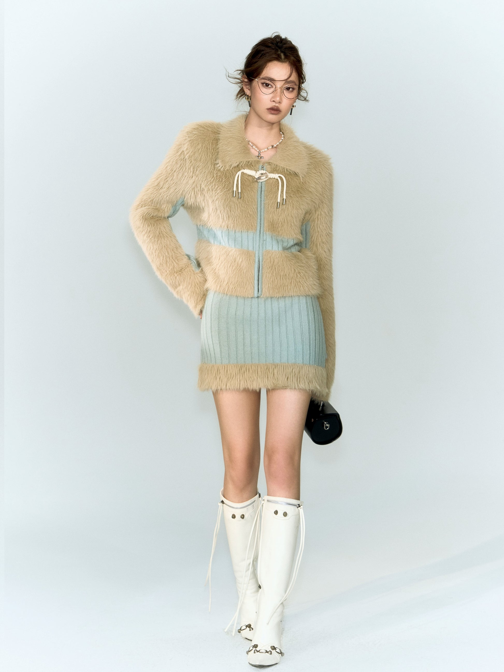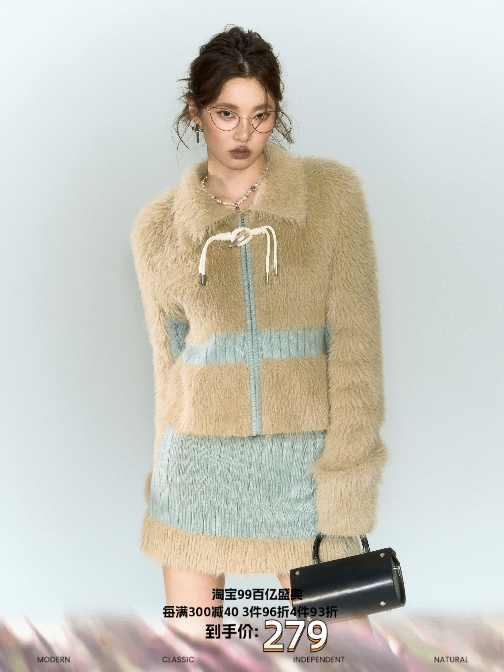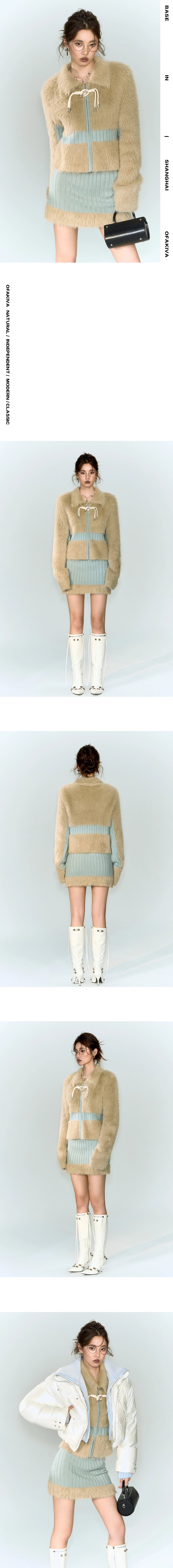 [スポット] OfAkiva「スプライシングその他」フェイクミンクニットパッチワークウィンターコートスカートスーツレディース