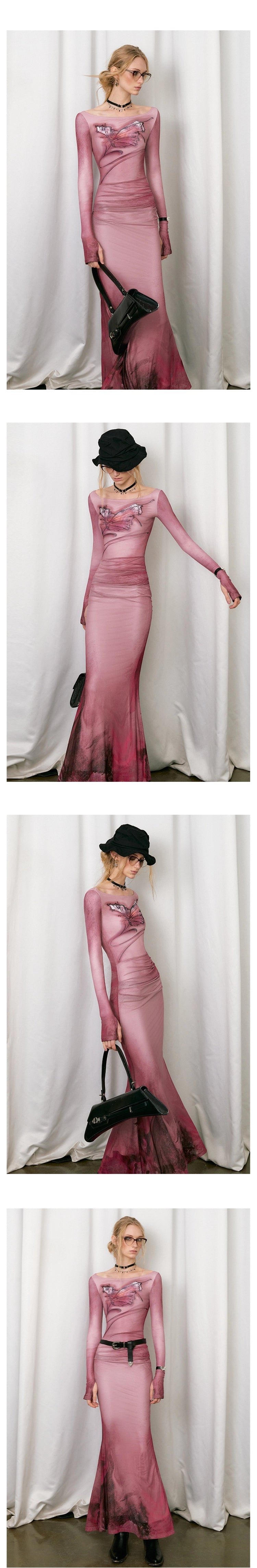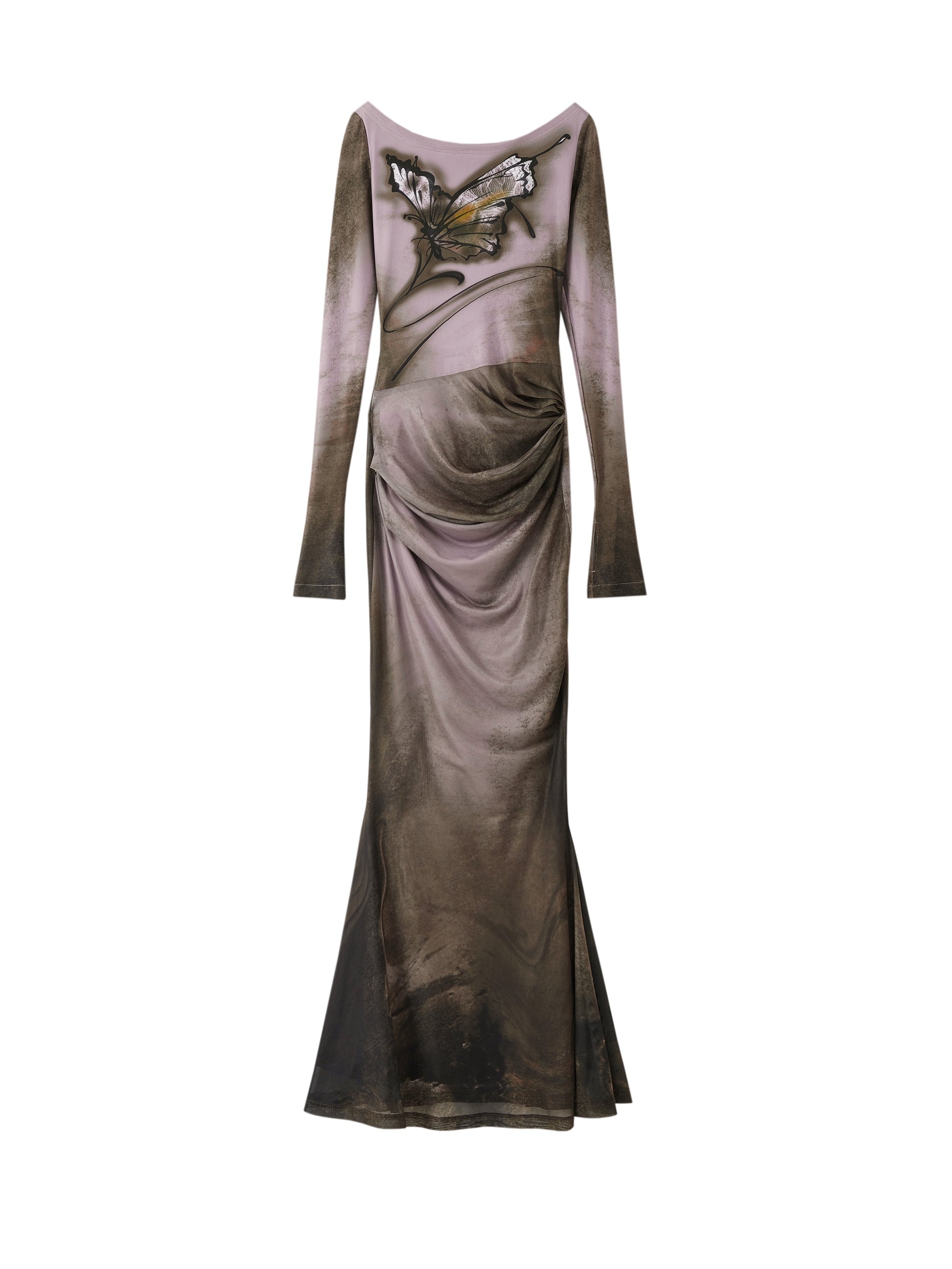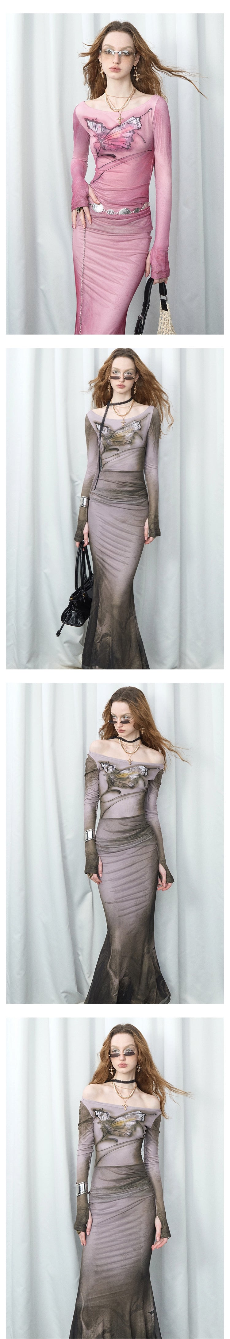 [スポット] OfAkiva「ドリームコアエステティック」バタフライプリントメッシュ長袖ボートネックフィッシュテールスカート女性