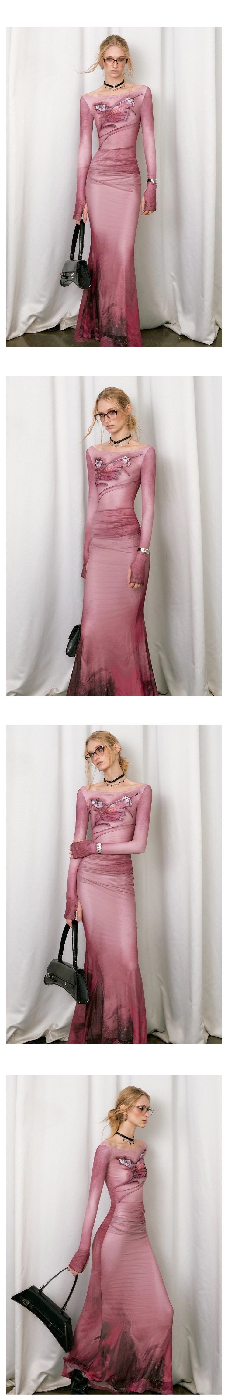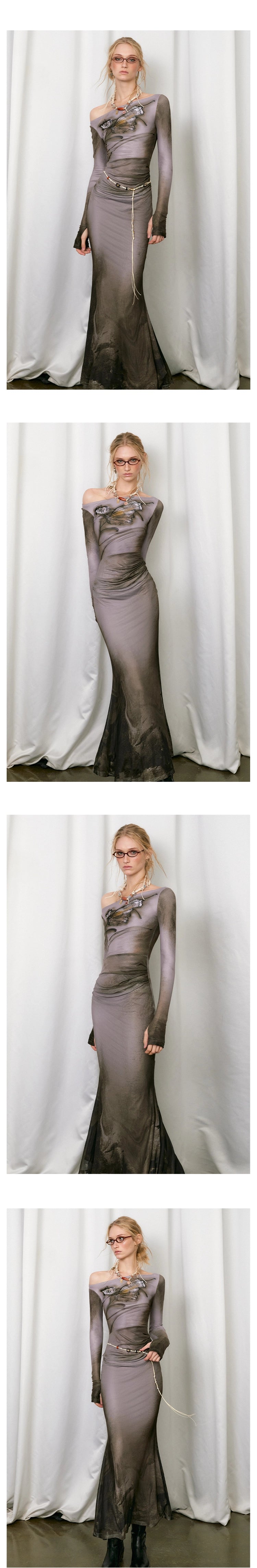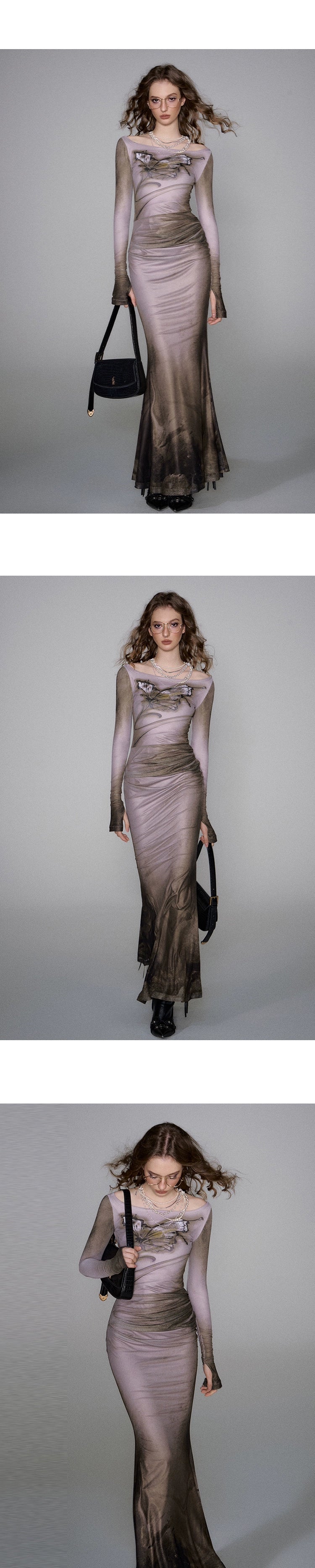 [スポット] OfAkiva「ドリームコアエステティック」バタフライプリントメッシュ長袖ボートネックフィッシュテールスカート女性