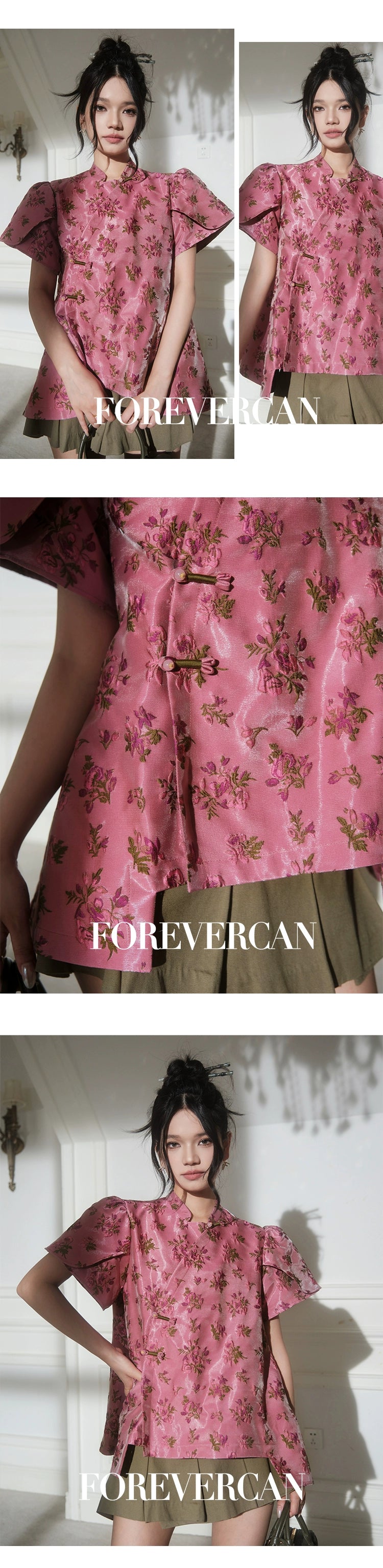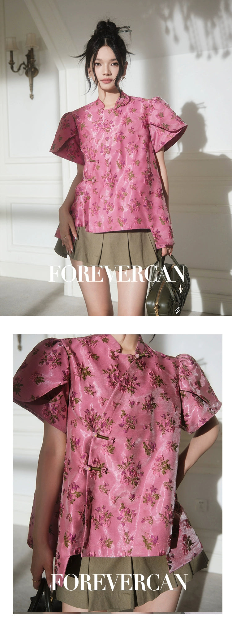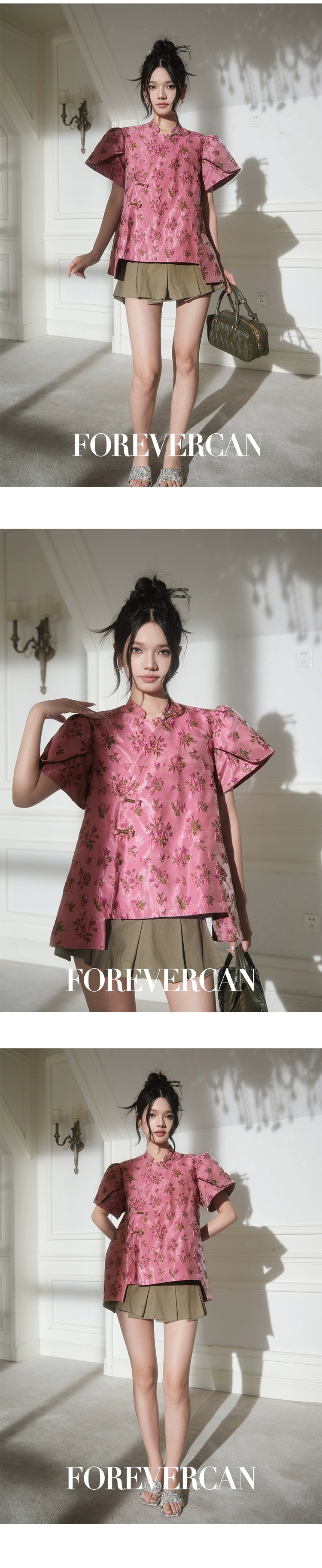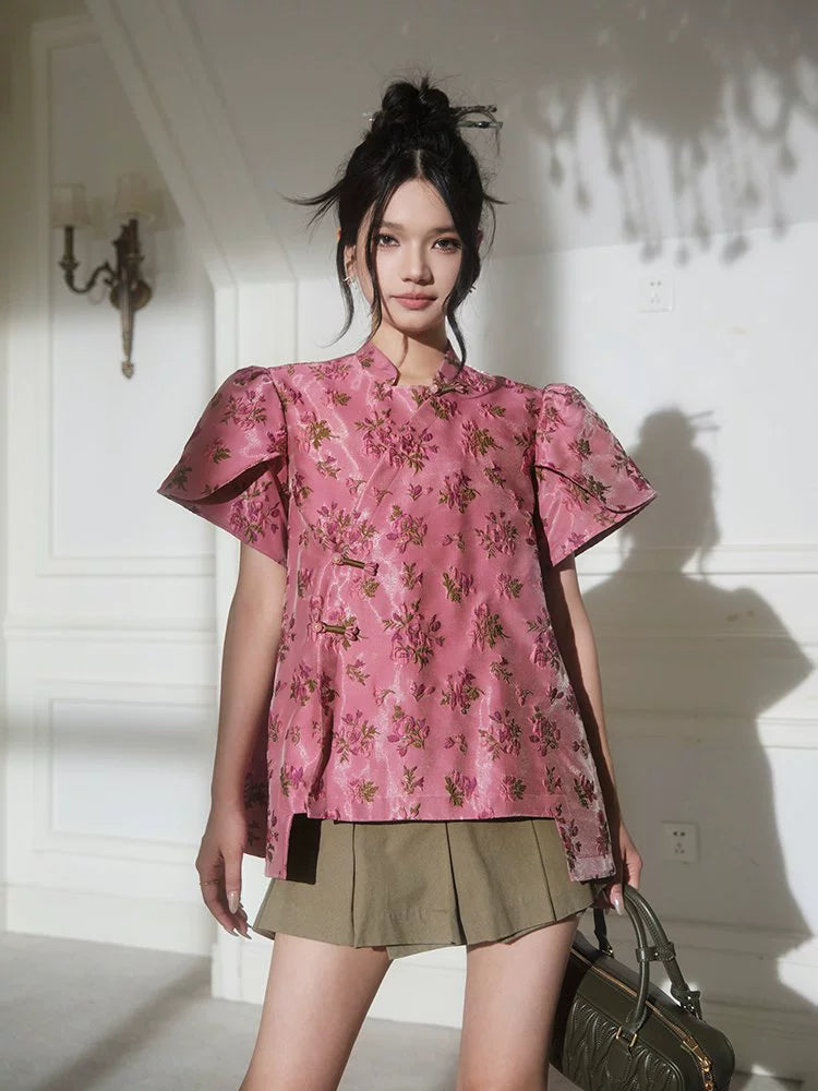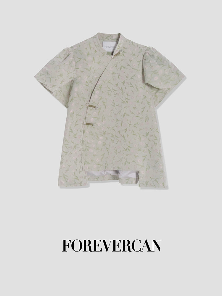 フォーエバーカンレディースサマー2024新しい中国スタイル新しい中国スタイルの高級気質パフスリーブ前立てトップス