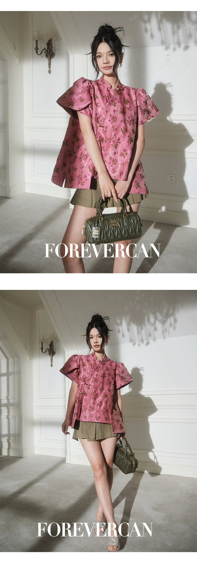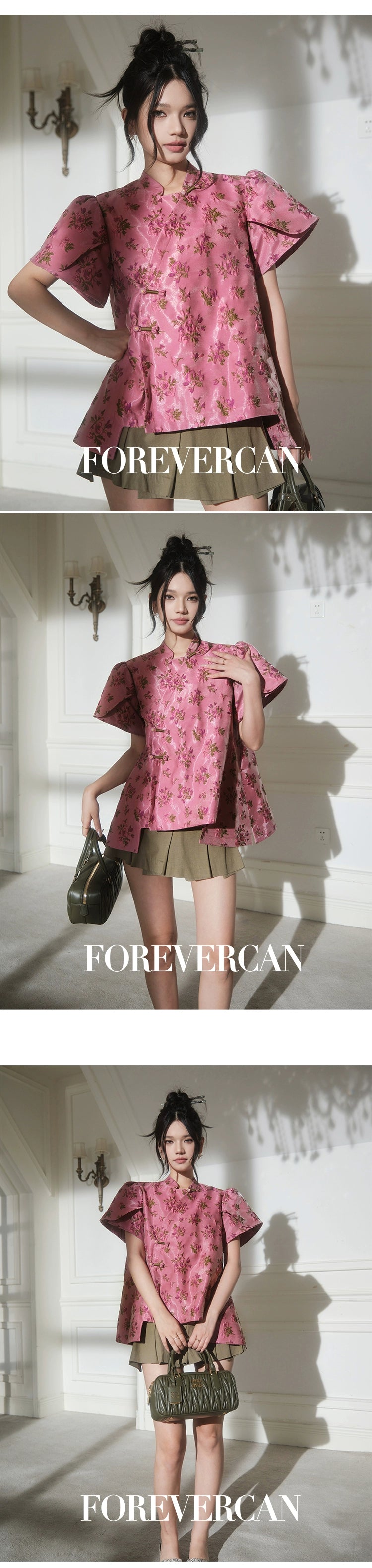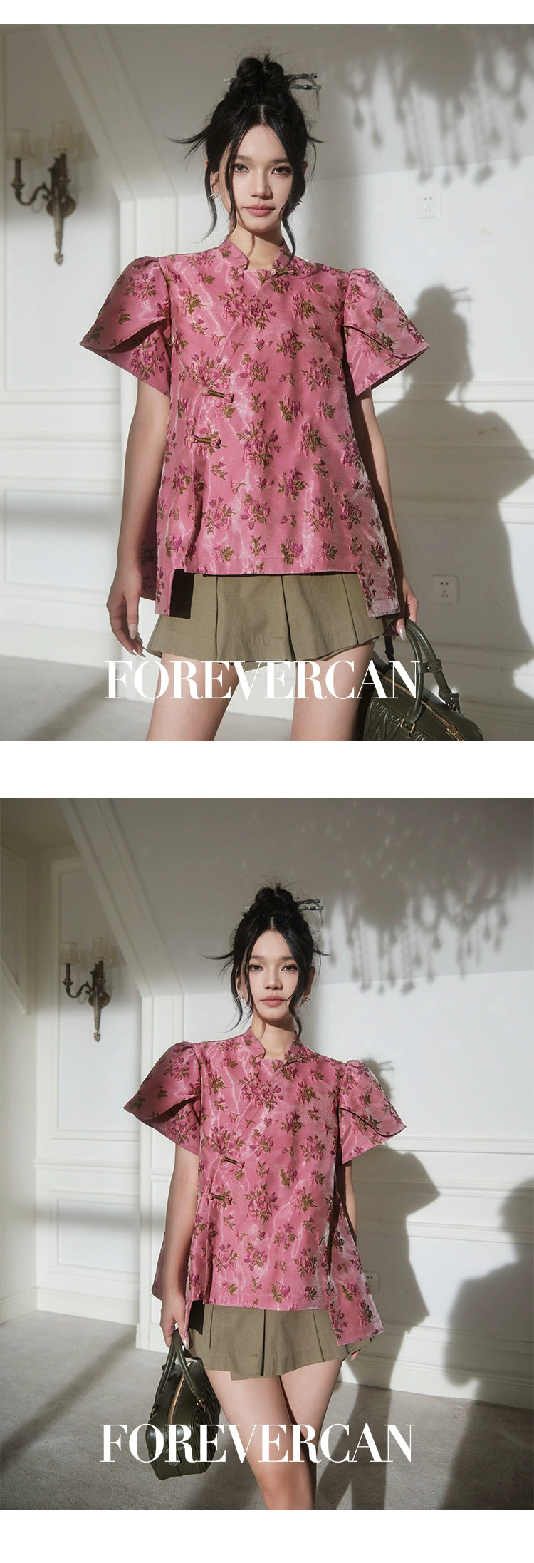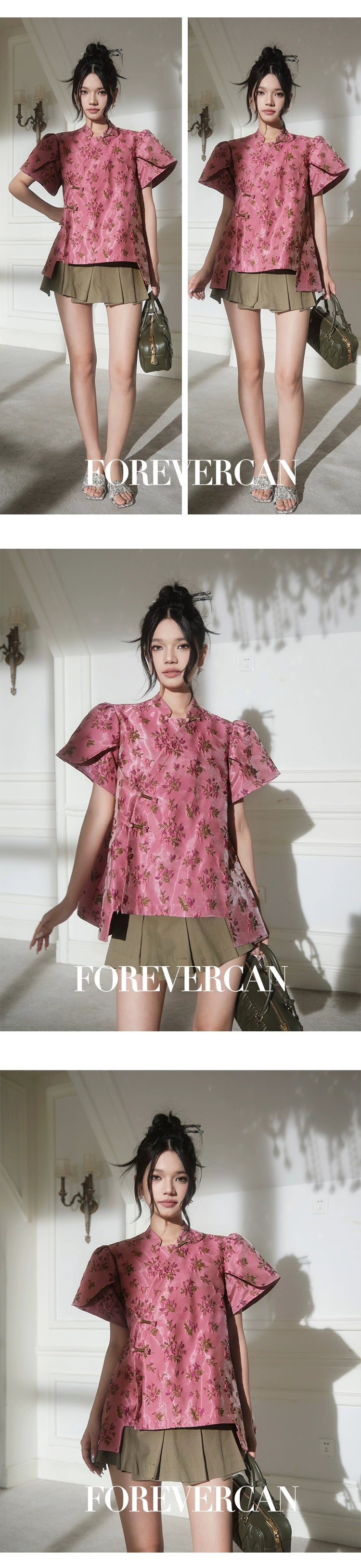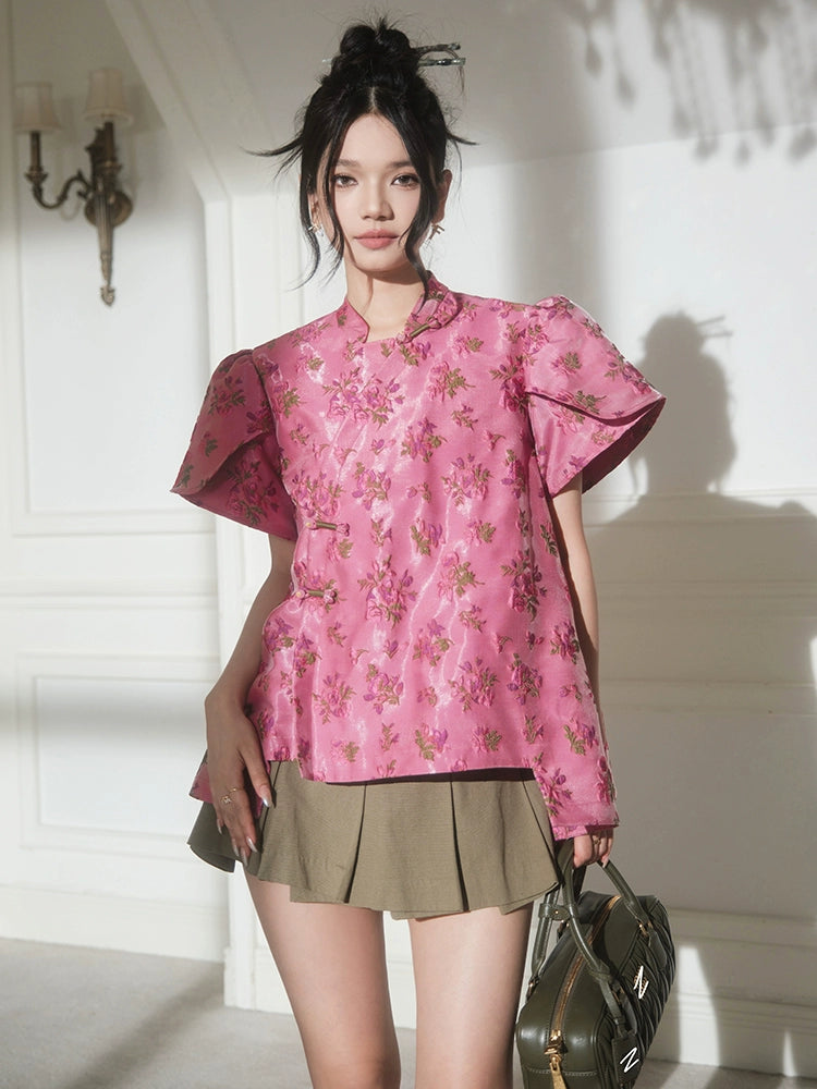 フォーエバーカンレディースサマー2024新しい中国スタイル新しい中国スタイルの高級気質パフスリーブ前立てトップス
