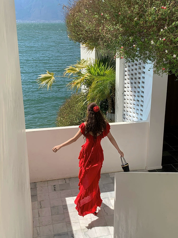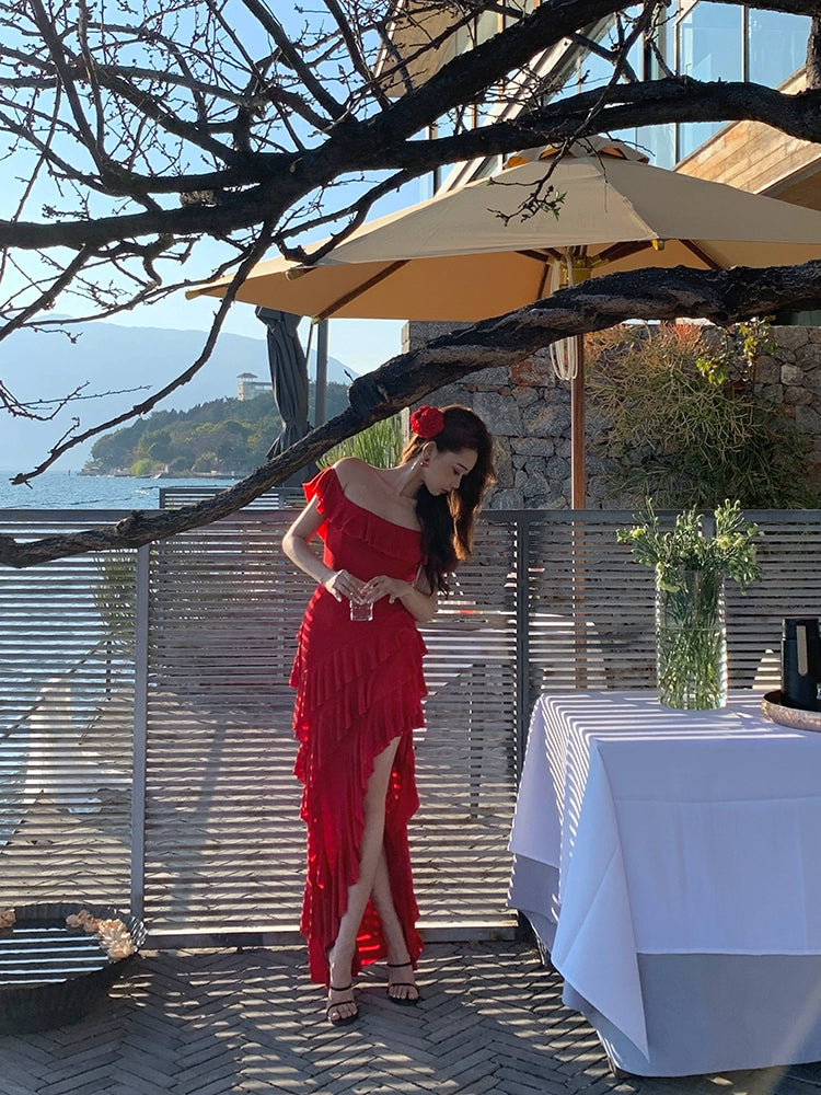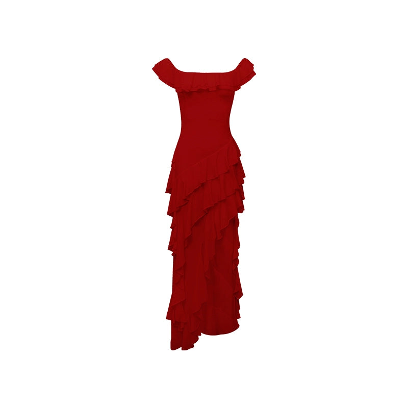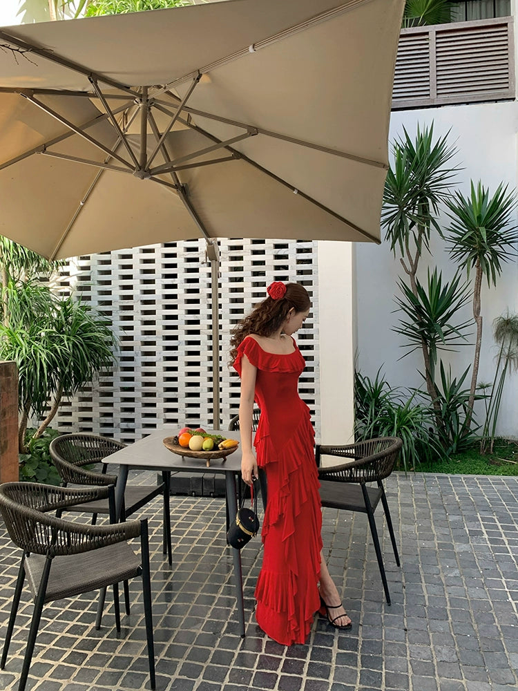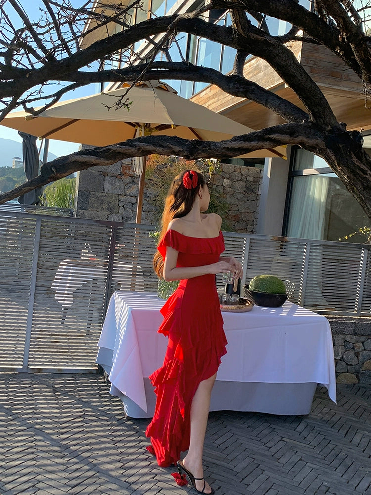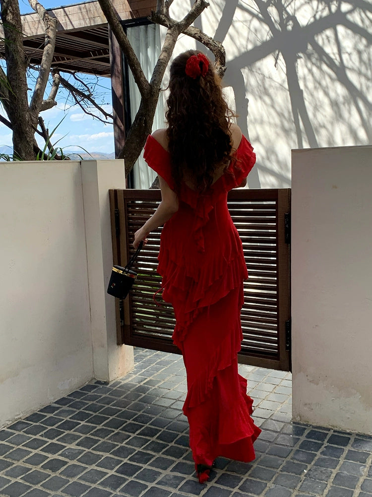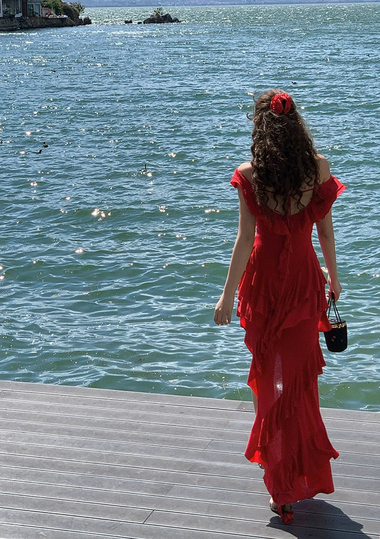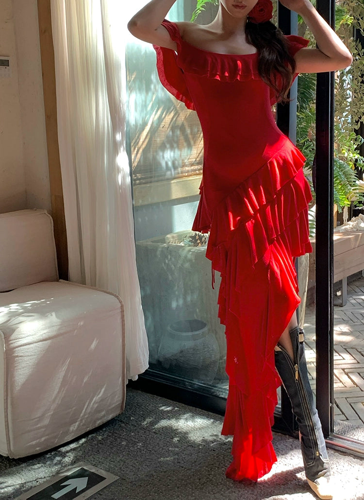 リトルコーラルテンセルウールレッドワンショルダードレス夏ニッチデザインフリルロングスカート