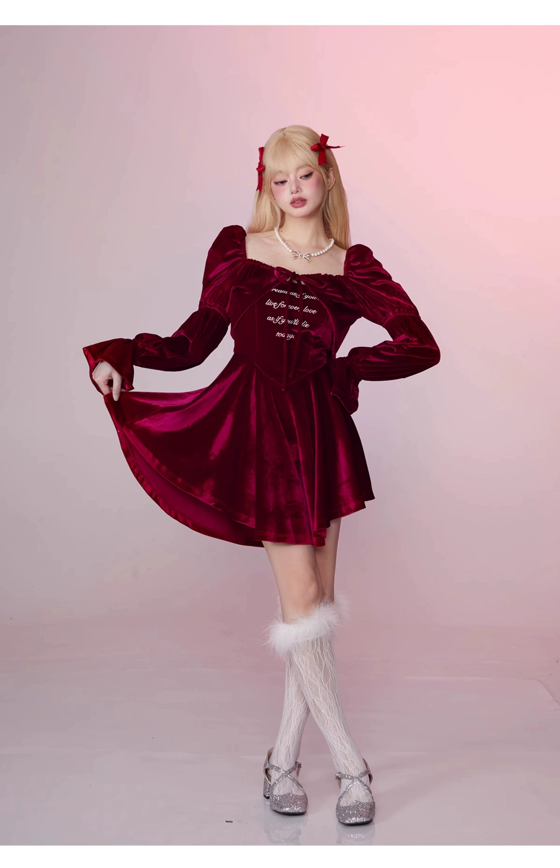 GirlyFancyClubのクリスマス大晦日の衣装は、ヴィンテージの赤いウエストベルベットのドレスとツーピースのプリンセスドレスです