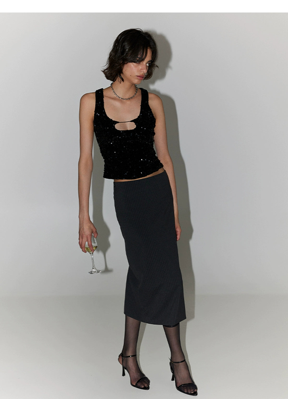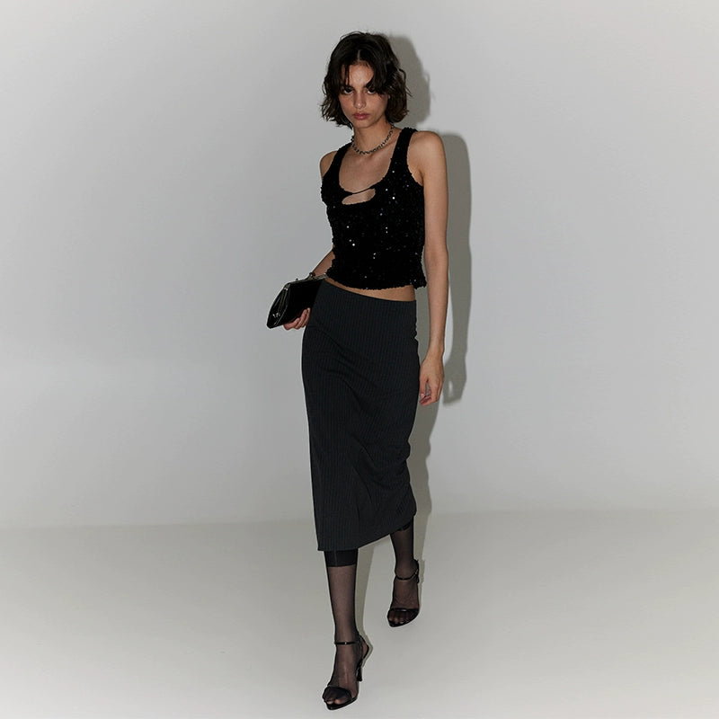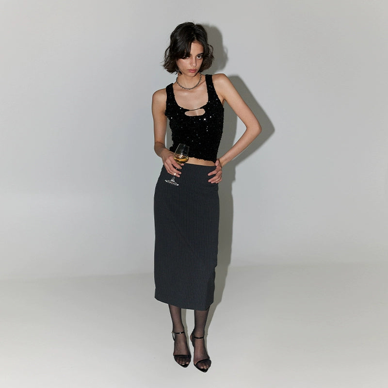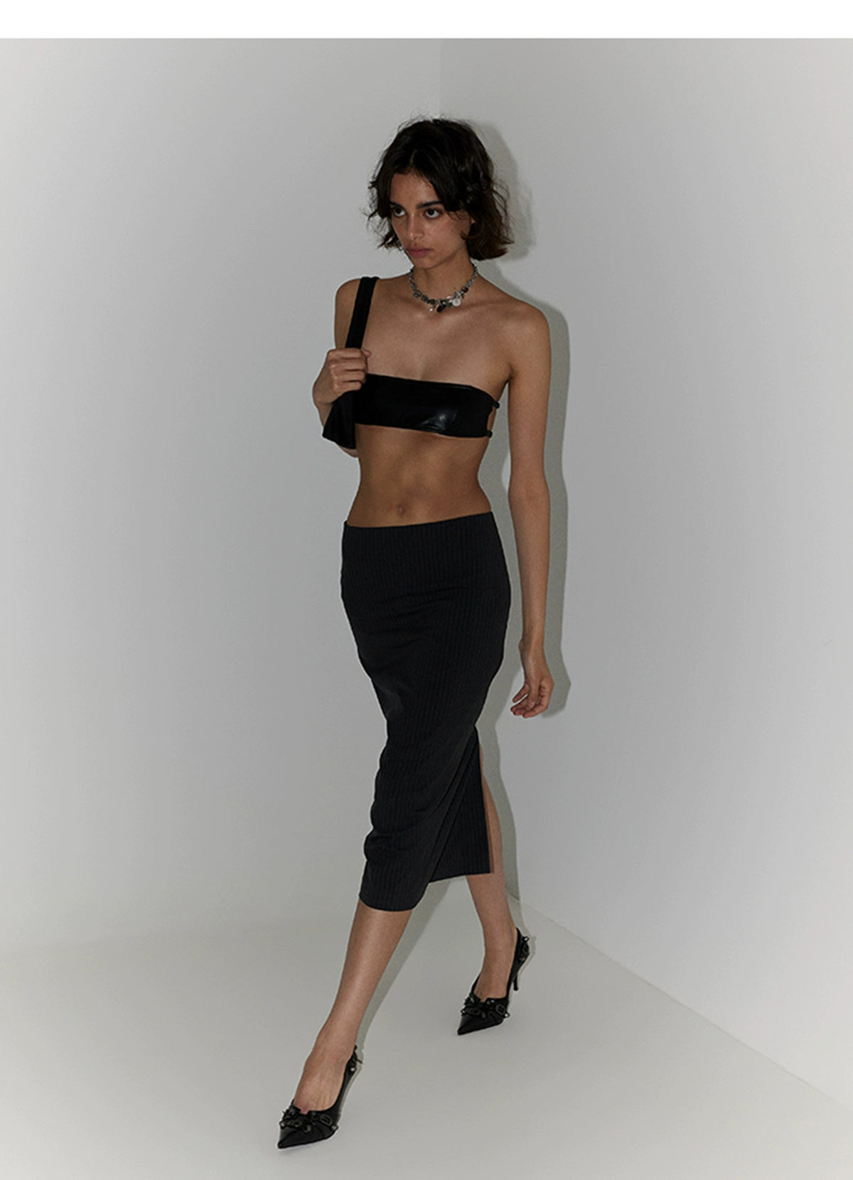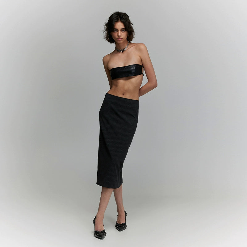 SansFrontieresグレーストライプスカートグレーファッショナブルなオーバーザニースーツスカート