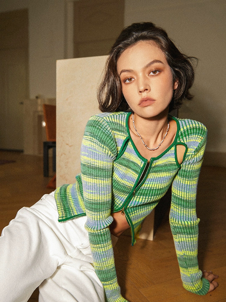 TR彼女のホットグリーンバタフライグリーンブレンドリブニットストレッチカットアウトスリムダブルジップカーディガントップ