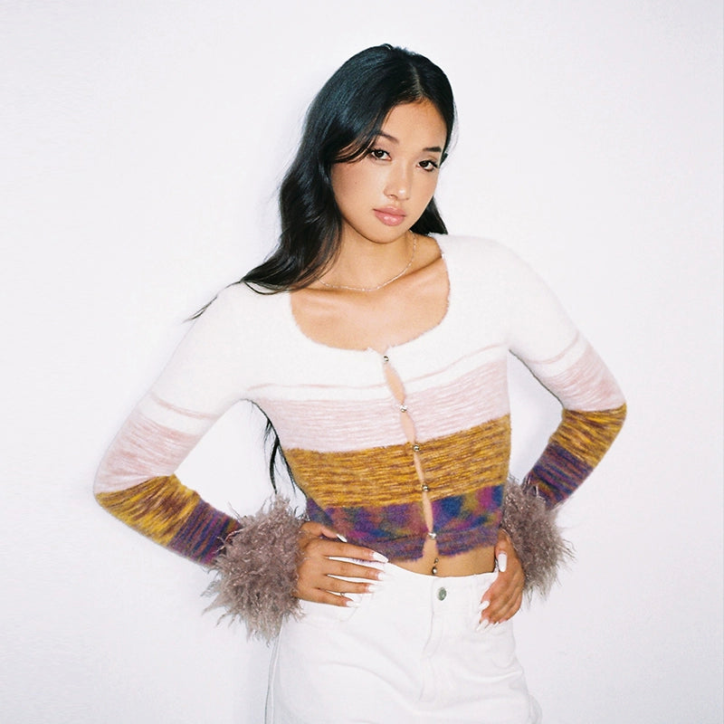 TR彼女のホットリトルテディカーリーカラー取り外し可能なグラデーションカットアウトニットクロップトップストライプスリムフィットカーディガン