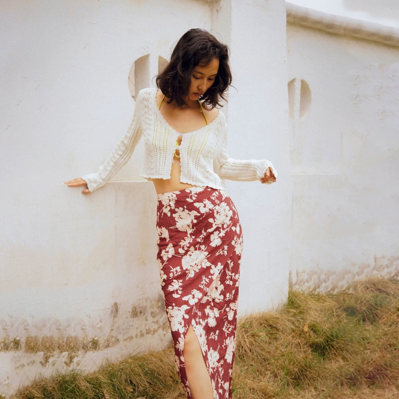 TR彼女の熱い攪拌レンガ色のプリントラップオーバーリゾートスリットジップアップスカート