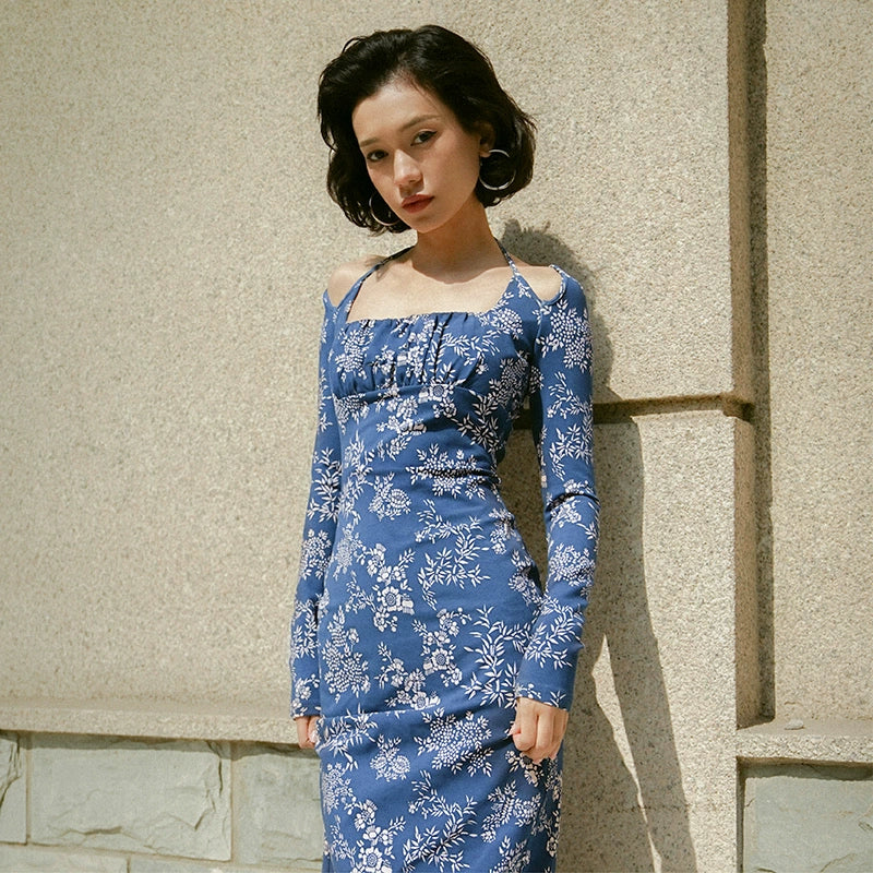 TR She ホットアシマ インディゴ染料 オリジナルデザインプリント マキシスカート スリムフィットタイ ヒップストレッチドレス