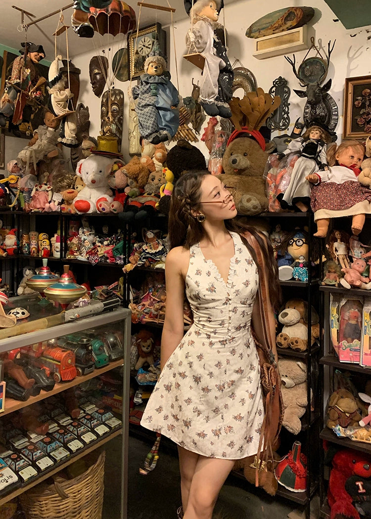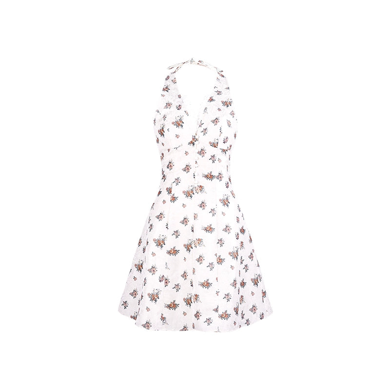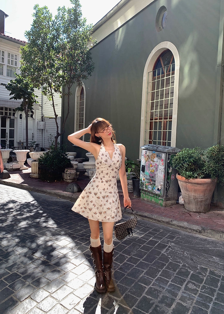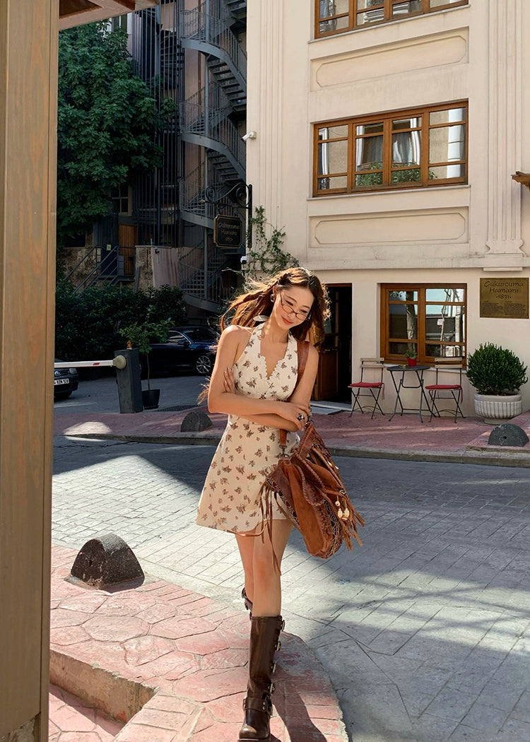 Xiaoli vine kiss 花柄ホルターネック サスペンダー A ライン ドレス 女性用 2024 年夏 小さな男 甘い気質 ショートスカート