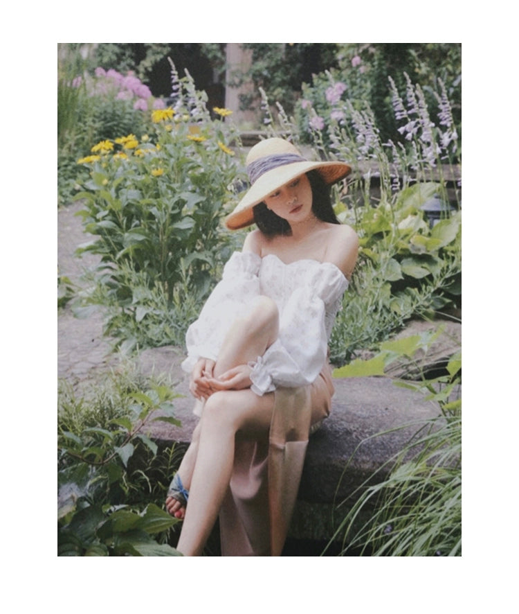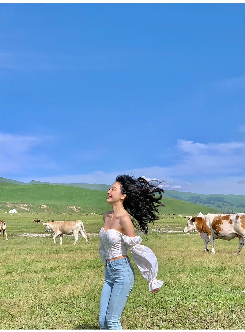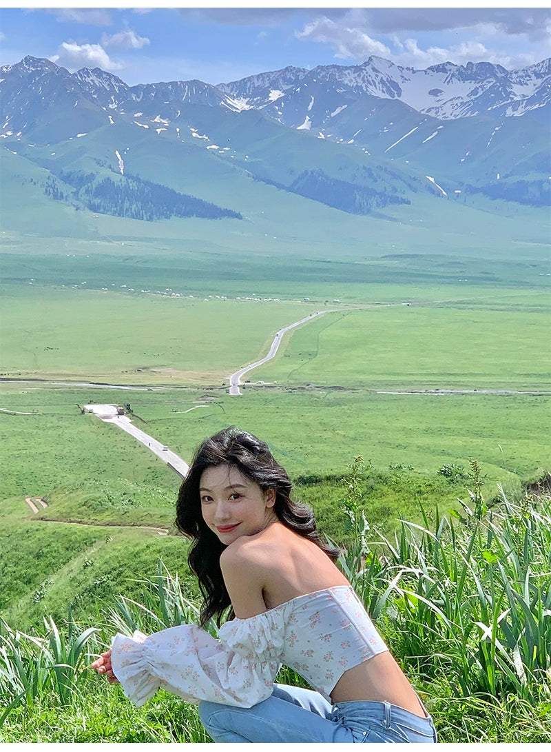 【Xiaoli X Yi Menglingジョイントシリーズ】ワンショルダーバブル長袖花柄シャツトップスプリング