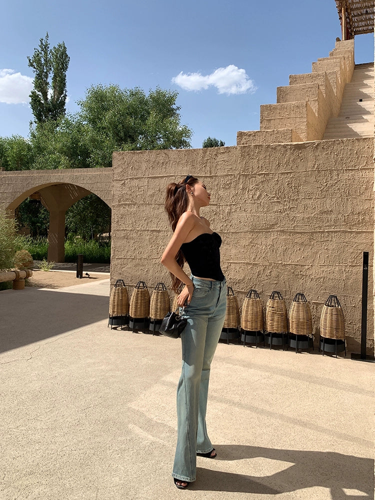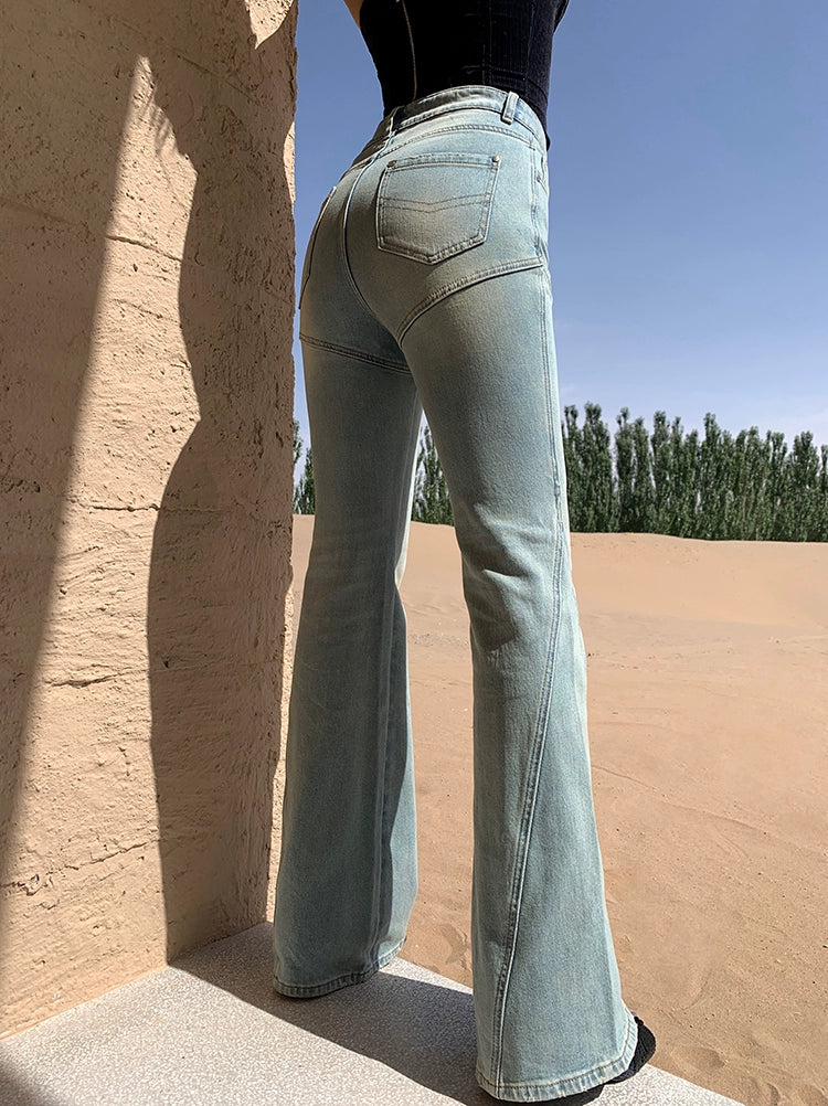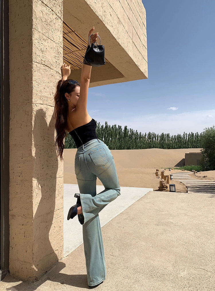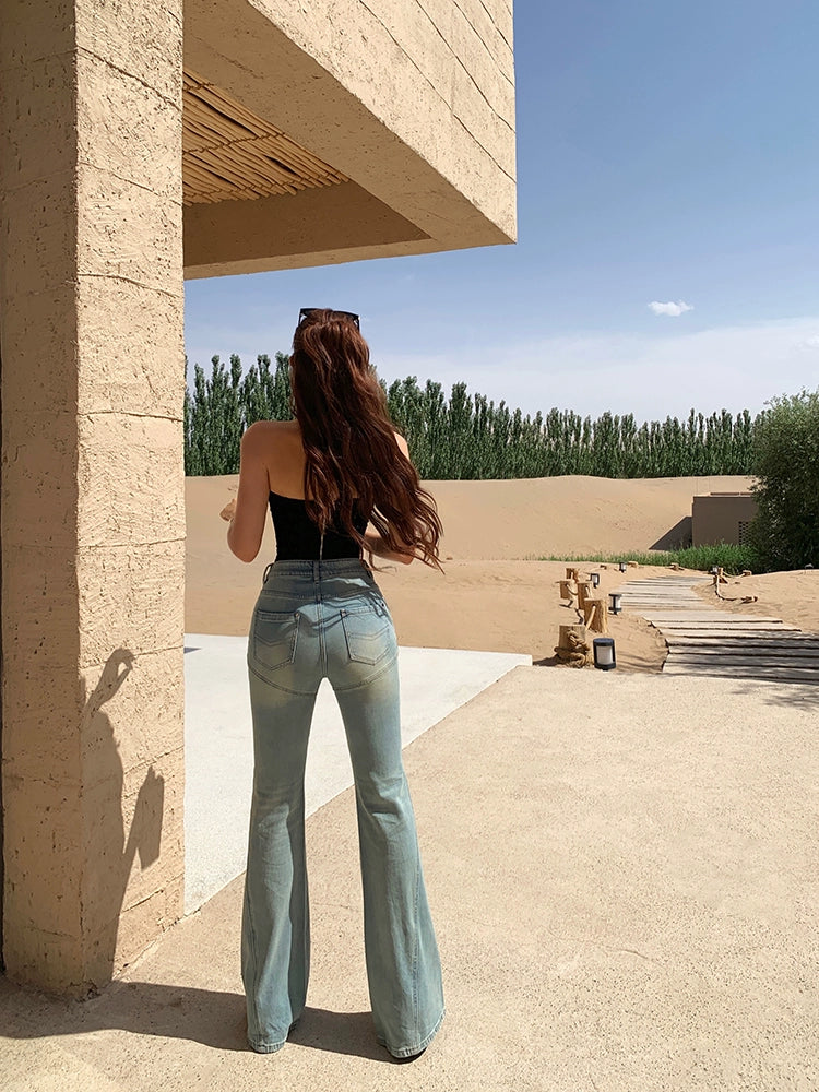 Xiaoliweiフレアストレートレッグワイドレッグジーンズ、夏の細いデザイン、レトロなスリムパンツ
