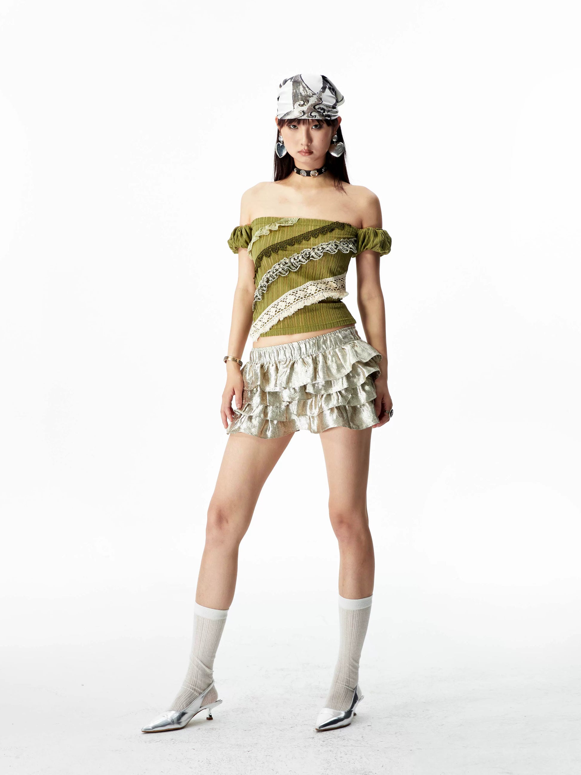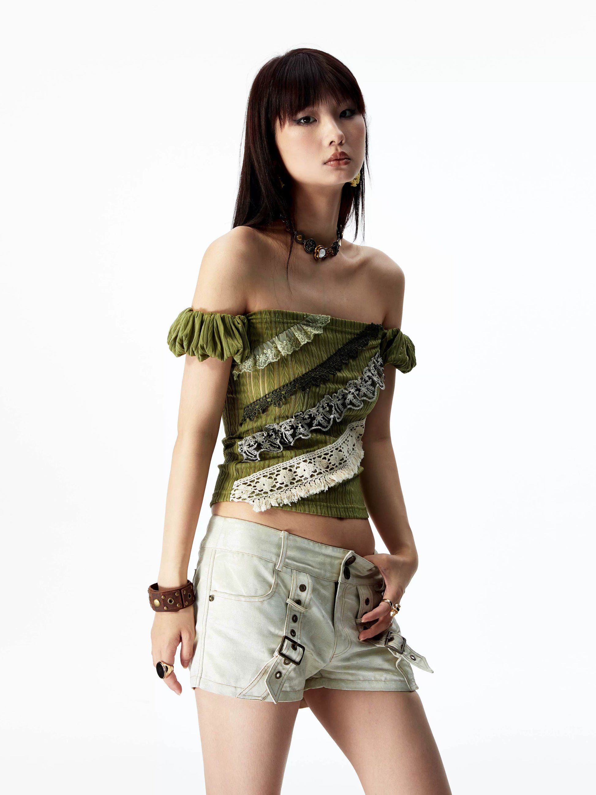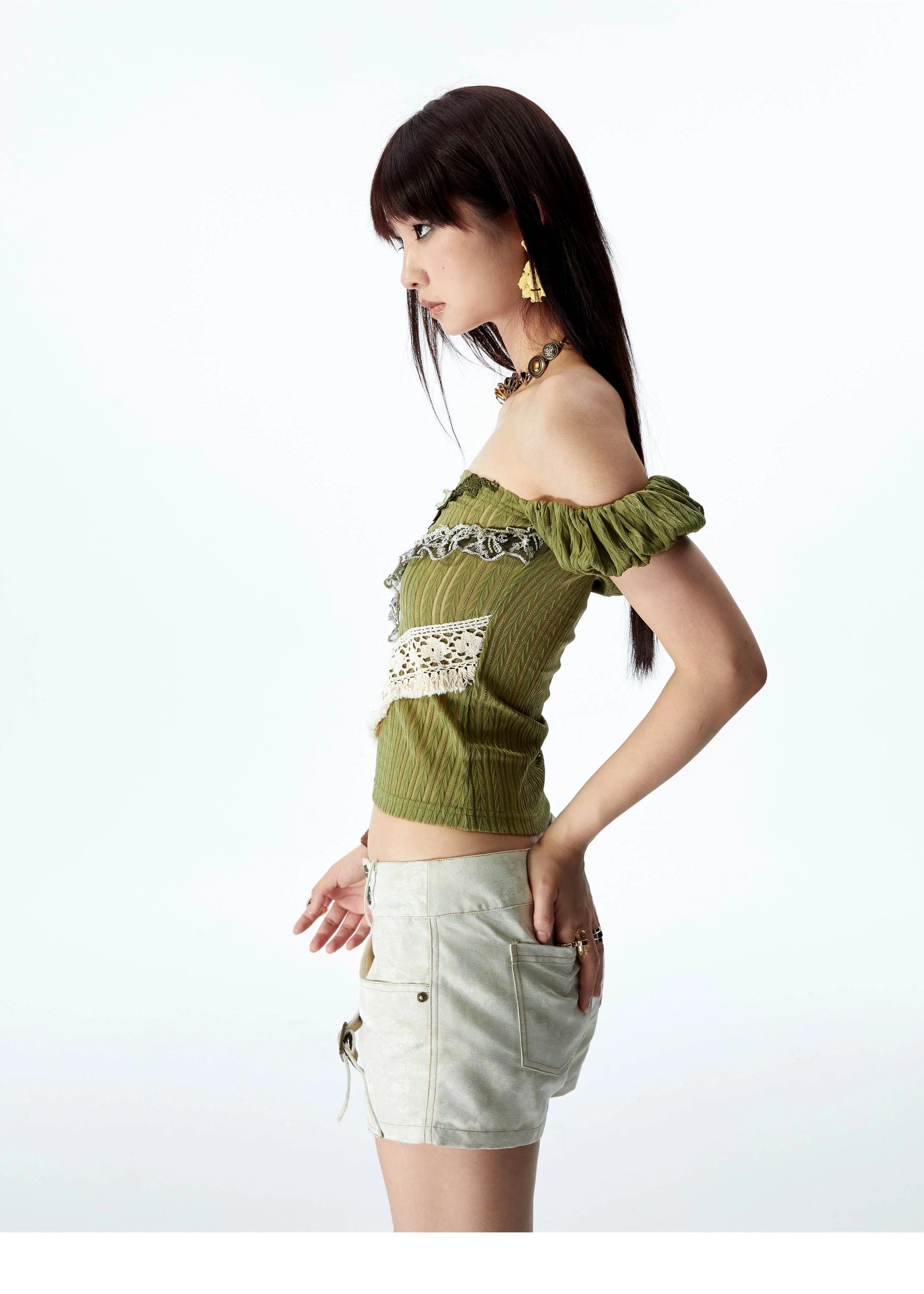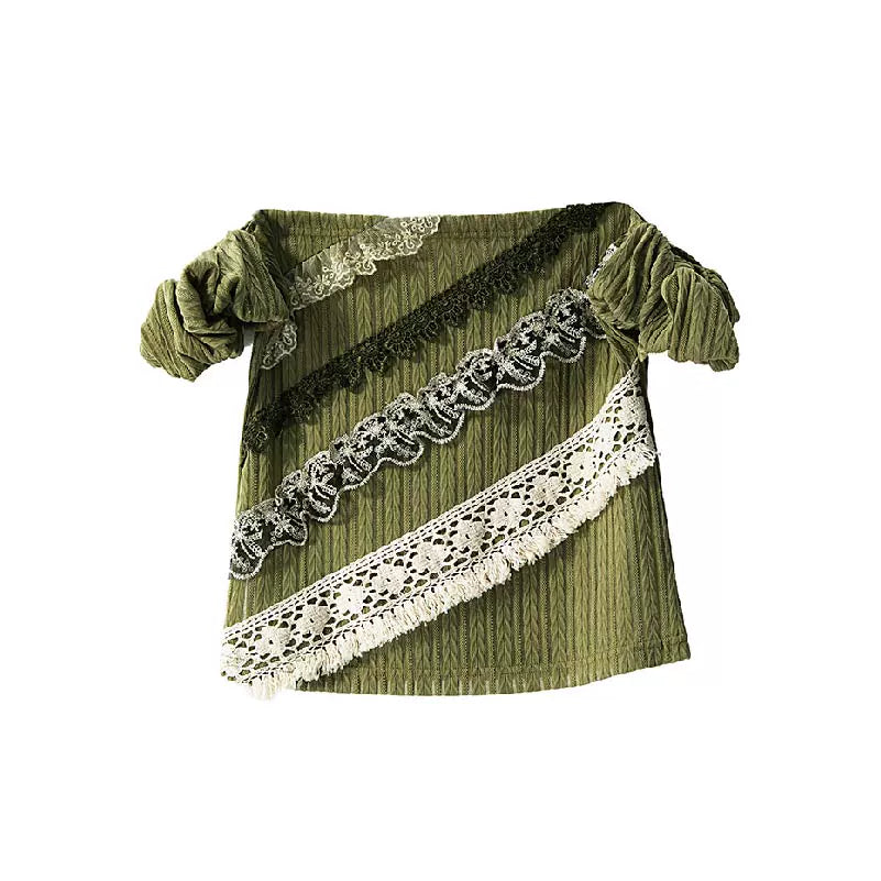 YOSHUYUKI オリジナルデザイン シダーグリーンストレッチニット ビンテージレース ストレートショルダー バンドゥ 半袖