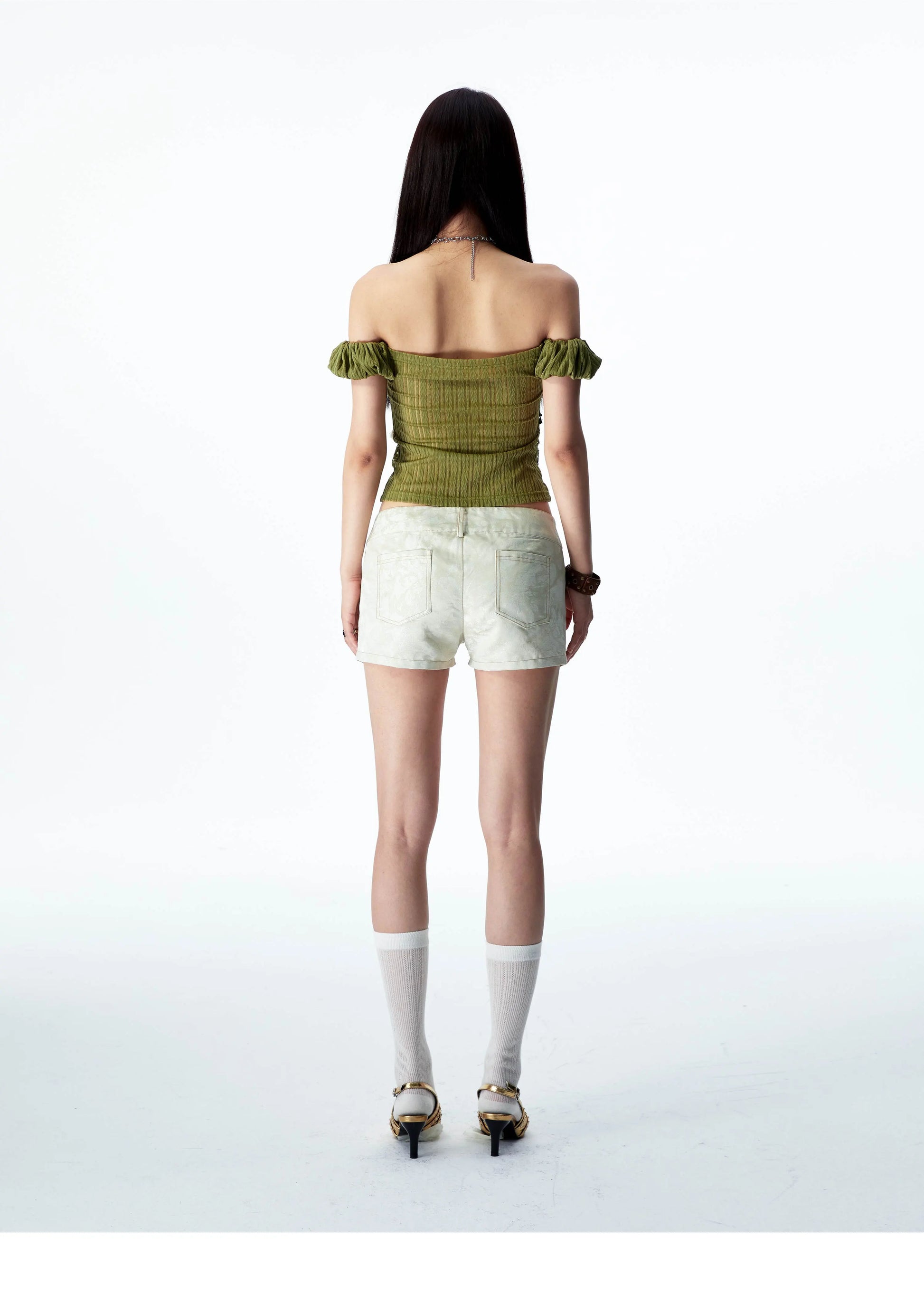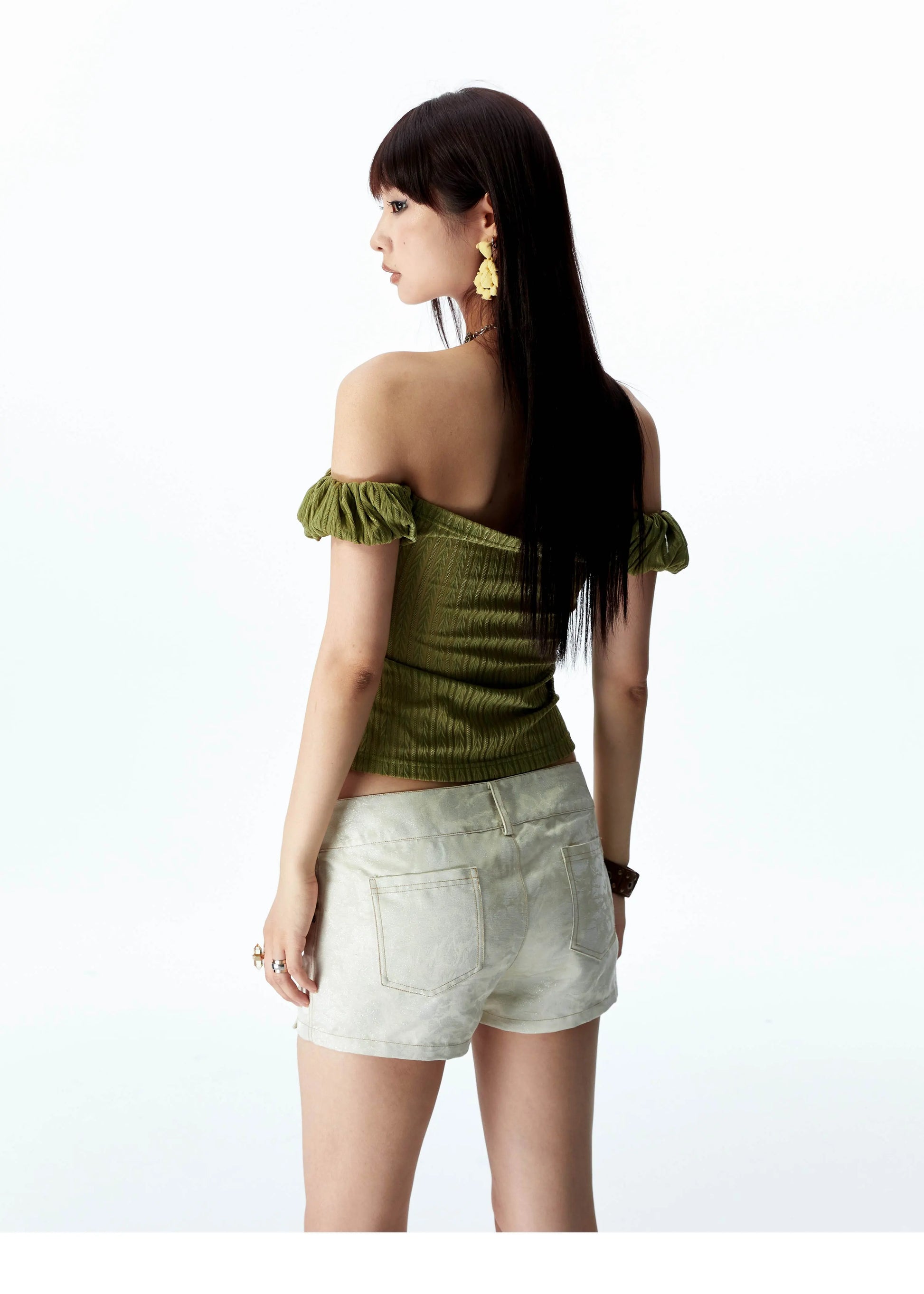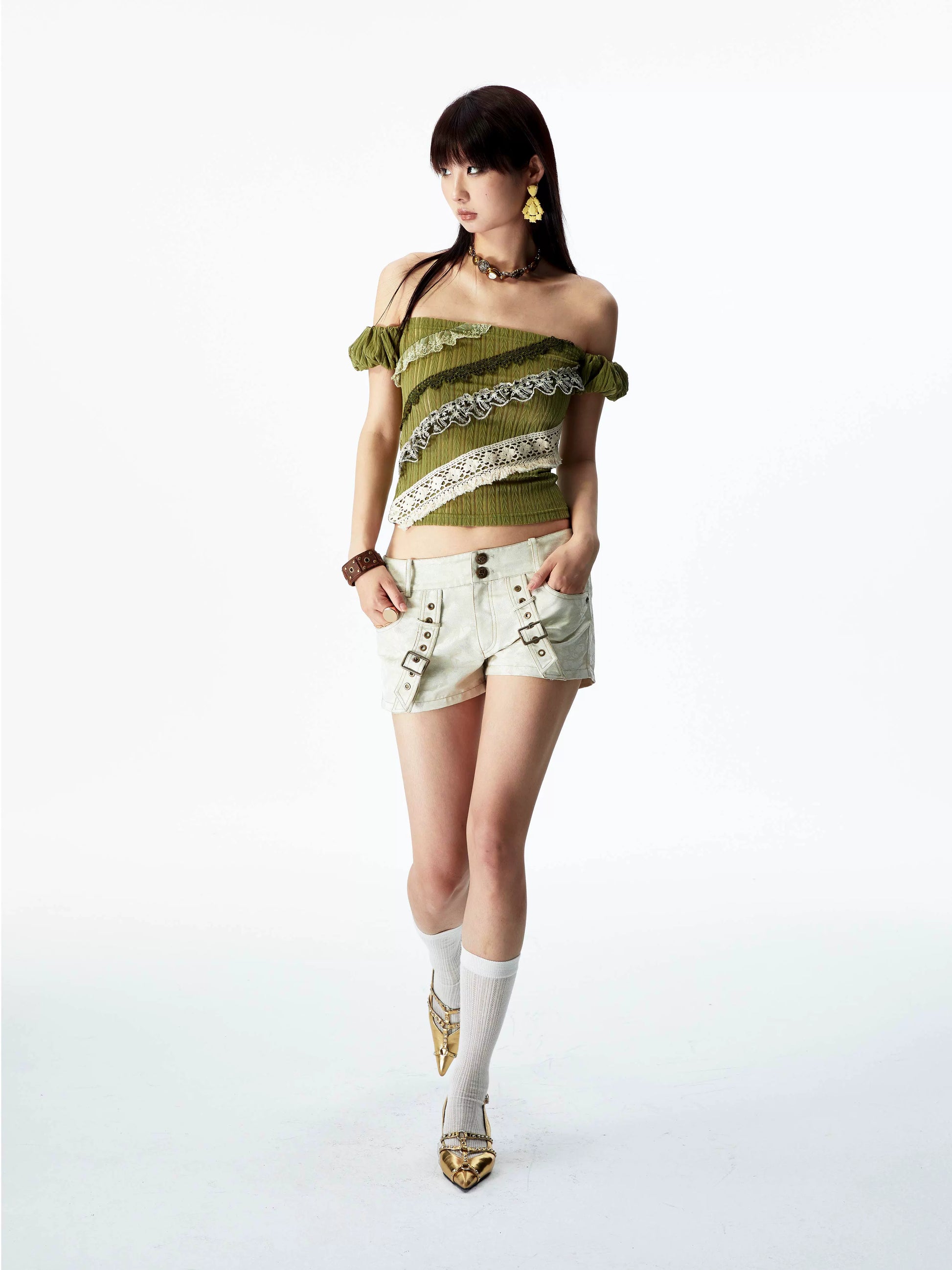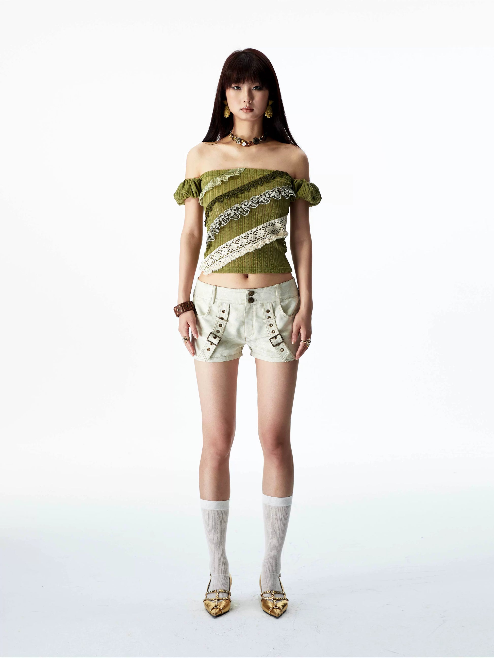 YOSHUYUKI オリジナルデザイン シダーグリーンストレッチニット ビンテージレース ストレートショルダー バンドゥ 半袖